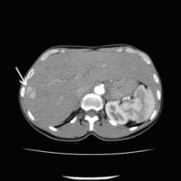 Computertomographische Darstellung eines hepatozellulären Karzinoms (Pfeil)